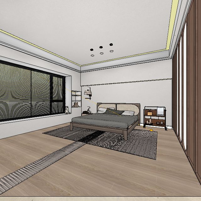 該設計方案以“初光”為主題,旨在創造一個溫暖舒適的臥室氛圍。設計運用了柔和的色調與自然的材質,突顯簡約與優雅。墻面的燈帶設計提供了柔和的間接照明,模擬晨光灑進房間的效果,增加了空間的層次感。木質家具與米色床品的搭配,營造出溫馨的質感。大面積的窗戶設計引入充足的自然光,配合黑色百葉窗,實現光線的自由調節。房間內精心選擇的裝飾品與藝術擺設,增添了整體空間的藝術氛圍,使居住者在享受舒適的同時,感受到濃厚的藝術氣息。